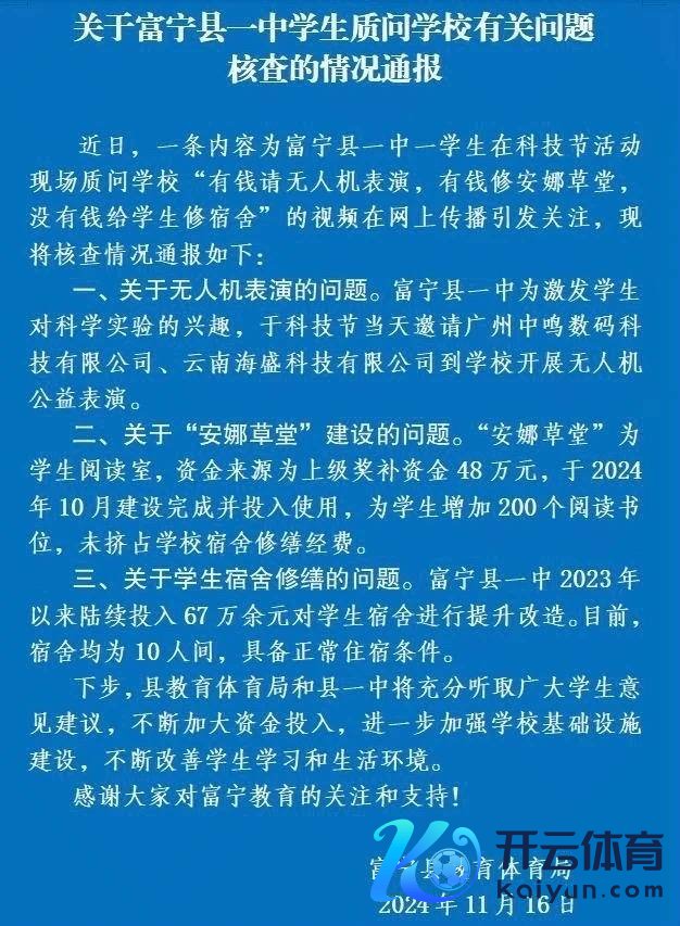 11月16日,富宁县教师体育局发布《对于富宁县一中学生责备学校联系问题核查的情况通报》称,近日,一条履当作富宁县一中一学生在科技节举止现场责备学校“有钱请无东谈主机饰演,有钱修安娜草堂,莫得钱给学生修寝室”的视频在网上传播引发温情,现将核查情况通报如下: