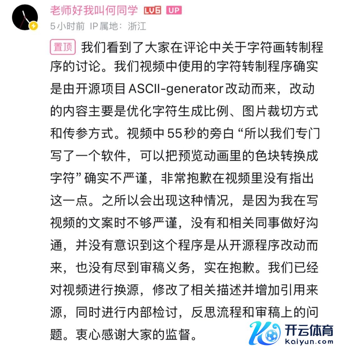 11月20日,读秒财经搜索发现,博主@安分好我叫何同学 的《我用36万行备忘录作念了个动画…》B站原视频中55秒的旁白“是以咱们特意写了一个软件,不错把预览动画里的色块养息成字符”,改成了,“咱们改了这个开源的软件,不错把预览动画里的色块养息成字符。”