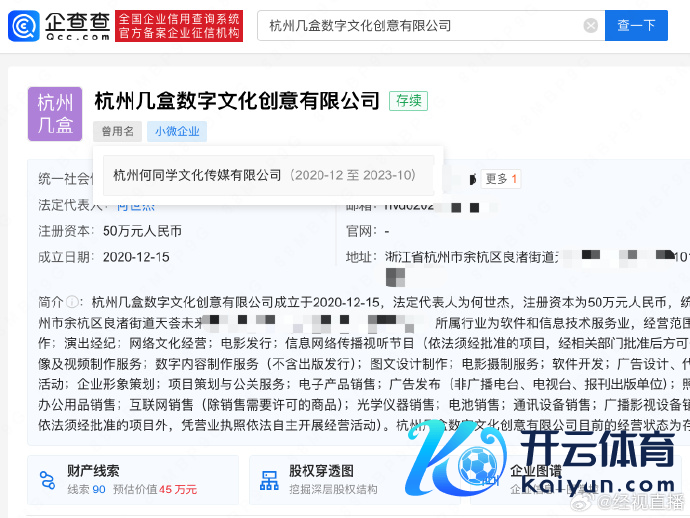 企查查APP泄漏,何世杰(何同学)名下关联1家杭州几盒数字文化创意有限公司,该公司建造于2020年12月,注册成本50万东说念主民币,何世杰在该公司担任法定代表东说念主并全资握股。客岁10月,该公司由杭州何同学文化传媒有限公司变更为现名。现时,该公司已得手注册多枚“何同学”商标。