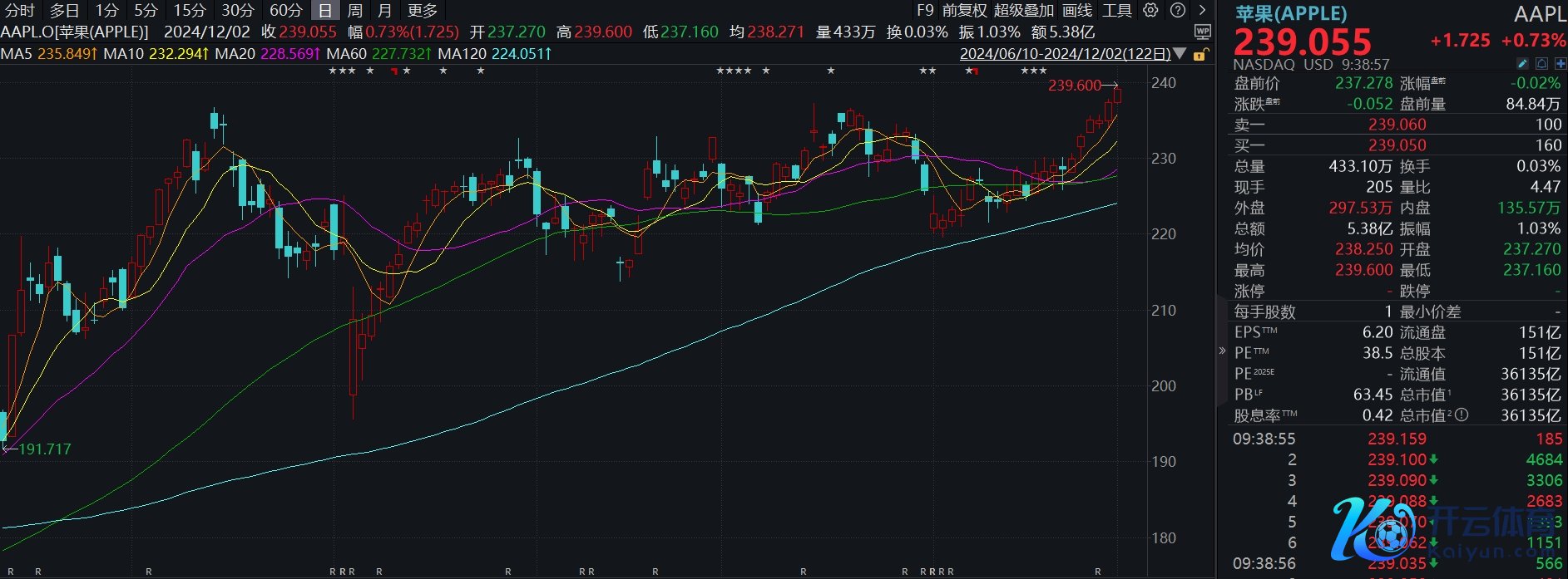 苹果公司股价再革命高,股价最高涉及239.60好意思元,总市值3.6万亿好意思元。