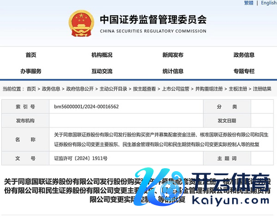 2024年12月27日,证监会发布关系公告,欢跃国联证券刊行股份购买资产并召募配套资金的注册肯求,这代表着,“国联证券+民生证券”细致整合干预持行阶段。