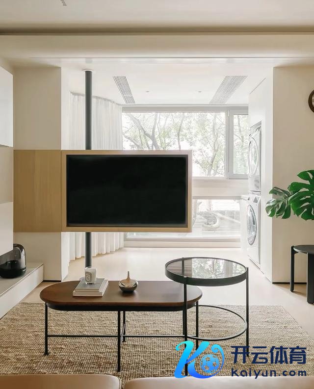 看电视时,电视旋转对着客厅,不看电视时,电视旋转一下,也不影响去阳台的动线。